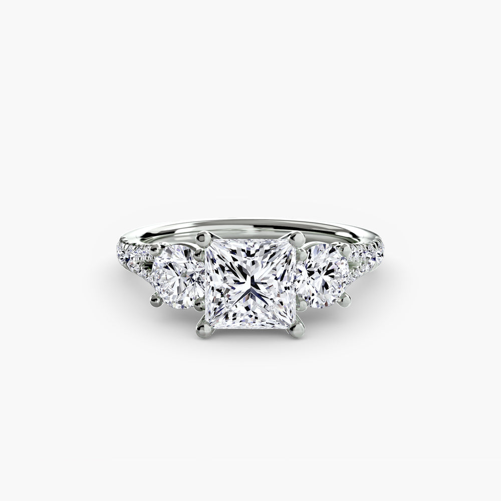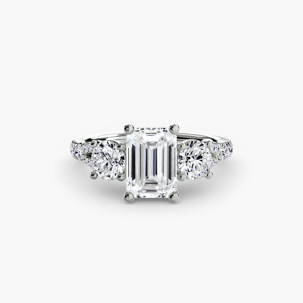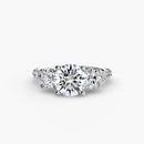 This elegant three-stone ring symbolizes your past, present, and future, elevated with a pavé band for extra sparkle and detail. A perfect union of meaning and brilliance.